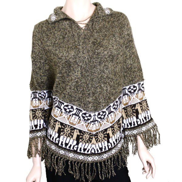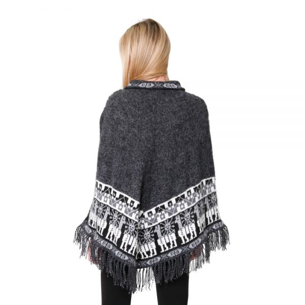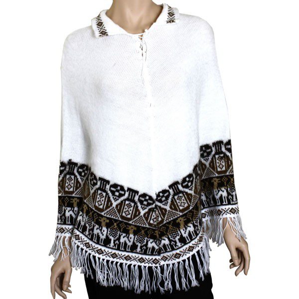 Soft alpaca poncho Ideal for cold weather, this alpaca poncho adorned with Inca motifs, glyphs and llamas to bring with it the grace and charm of Andean Fashion. Knitted of soft alpaca wool, this stunning poncho features a V-neck with collar and fringe. Choose from one of four natural colours of this exquisite fibre for your ideal cold winter fashion item.