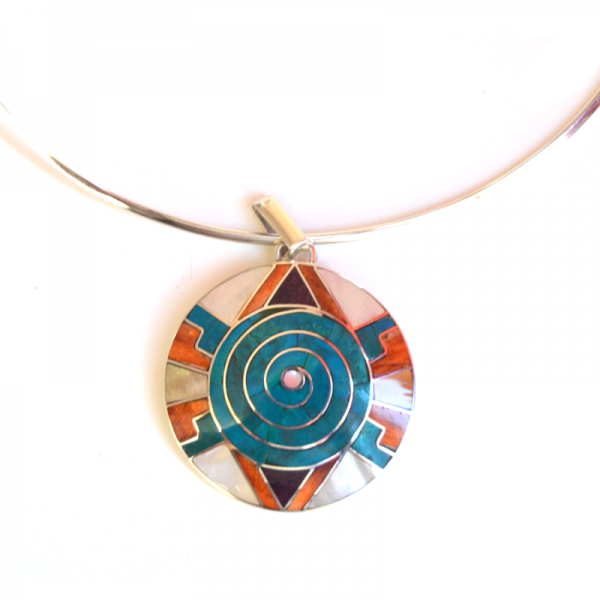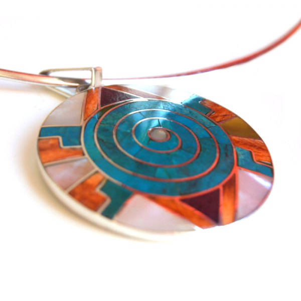 Pendant with 950 silver base inlaid mother of pearl, shell and chrysocolla spondylus