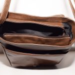 Application blanket over brown leatherette. Zippered mouth. Cover withmagnetic clasp. Inside is black fabric lining, padded interior. 24cm front pocketand back pocket of 16 cm.
