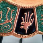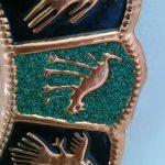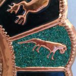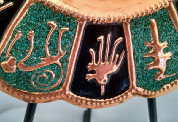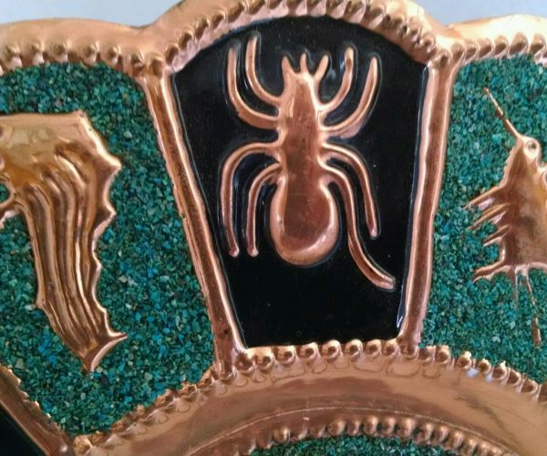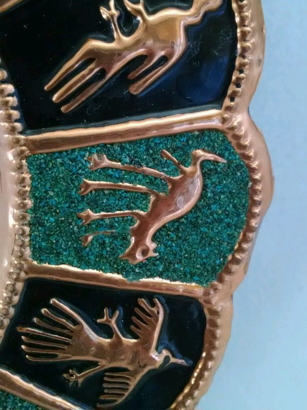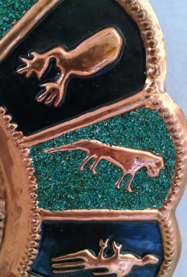 The plate is made with copper and turquoise stones.