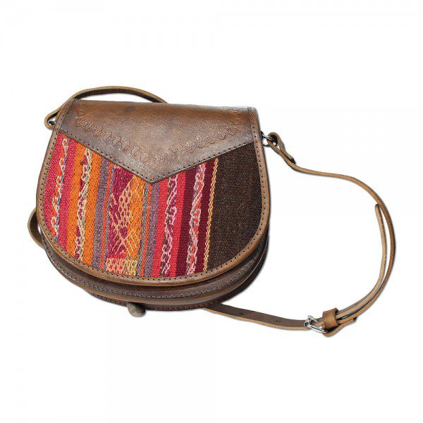 This petite but sturdy boxy-constructed shoulder strap bag is made of genuine cow’s leather with unique handwoven sheep wool aguayo cloth inset. Aguayo is a typical fabric of the Andes characterized by its durability and colorfulness. The bag has two small zip pockets, an adjustable strap and a magnetic clasp closure. Leather is embossed with decorative designs. Your choice of styles. Made in Perú.