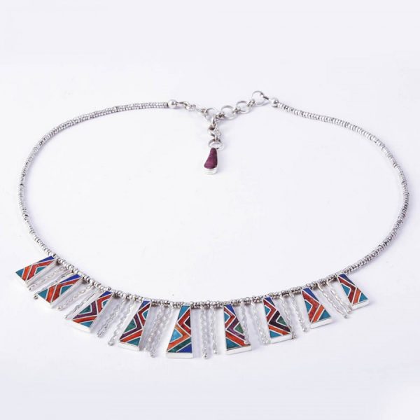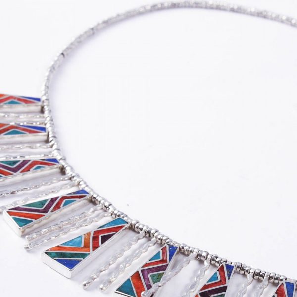 Silver necklace inlaid Chrysocolla, Peruvian turquoise, sodalite and spondylus.
